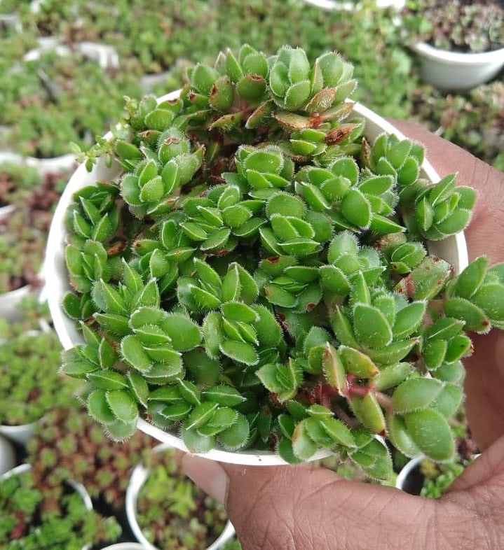 This slow-growing succulent is ideal for container gardens, hanging baskets, or as a ground cover in rock gardens. It thrives in well-draining soil and prefers bright, indirect sunlight. In late spring or early summer, it may produce small, white or pink star-shaped flowers, adding a delicate touch to its already charming look.