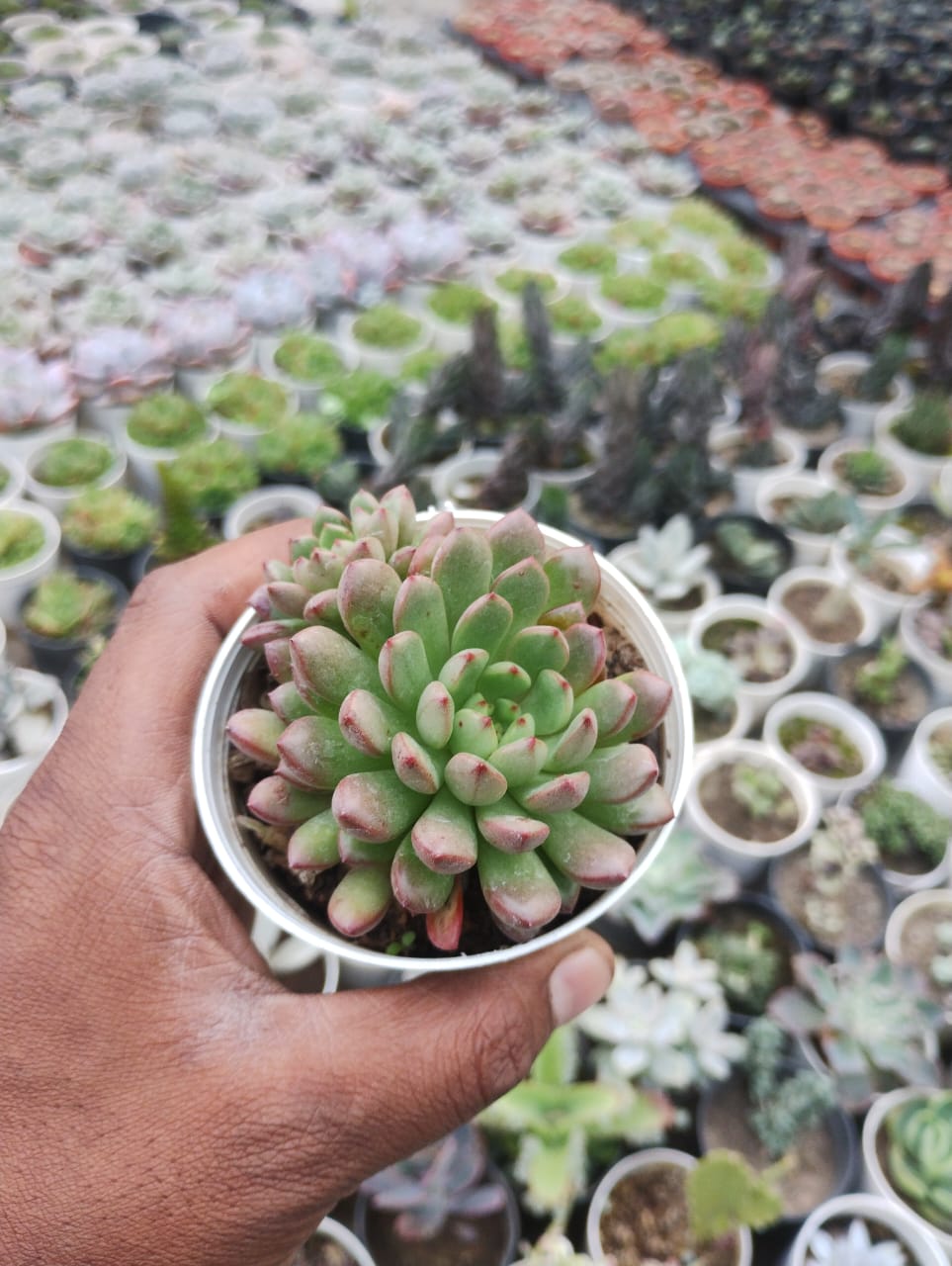 Graptoveria ‘Bashful’ is a charming succulent that showcases a delightful rosette form with a unique blend of colors. This hybrid, a cross between Graptopetalum and Echeveria, features thick, fleshy leaves that are typically pale green or blue-gray, often with a lovely blush of pink or lavender at the tips when exposed to bright sunlight. The leaves are arranged in a compact rosette, giving the plant a full and lush appearance.