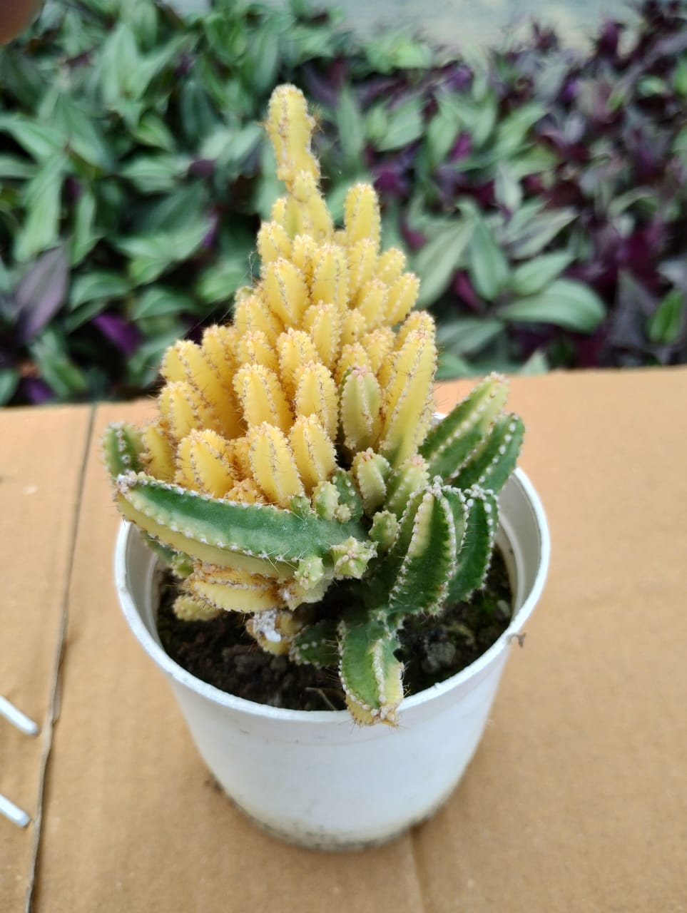 The Variegated Fairy Castle Cactus, scientifically known as Acanthocereus tetragonus variegata, is a unique and visually striking cactus recognized for its tall, upright growth and multi-branched structure that resembles a whimsical castle. The variegated variety showcases creamy white or yellow stripes intermingled with green on its stems, giving it a distinctive and eye-catching appearance.